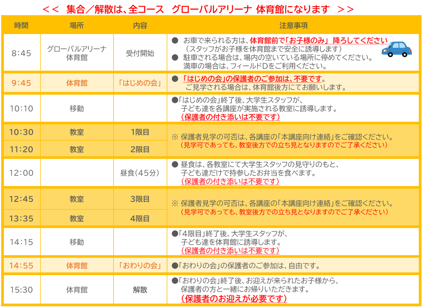 【全コース共通の持ち物】 弁当、水筒、筆記用具